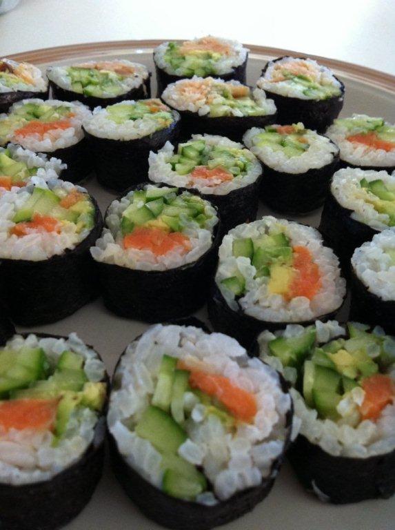 Most of the prepared (store bought) sushi rolls contain wheat and soy ingredients. Its fairly easy and fun to make your own.