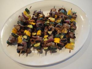 3. Thread the beef cubes alternately with the vegetables onto the skewers.