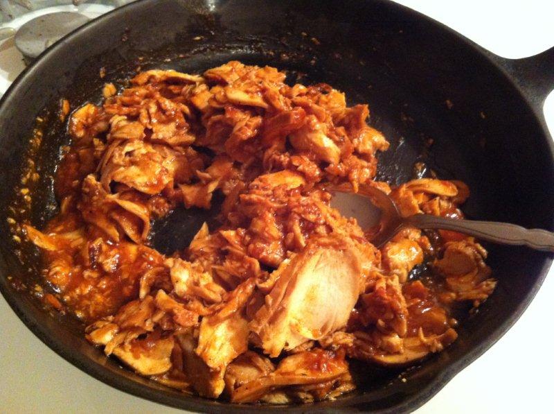 3. Thinly slice or shred the chicken and add to the sauce in the frying pan.