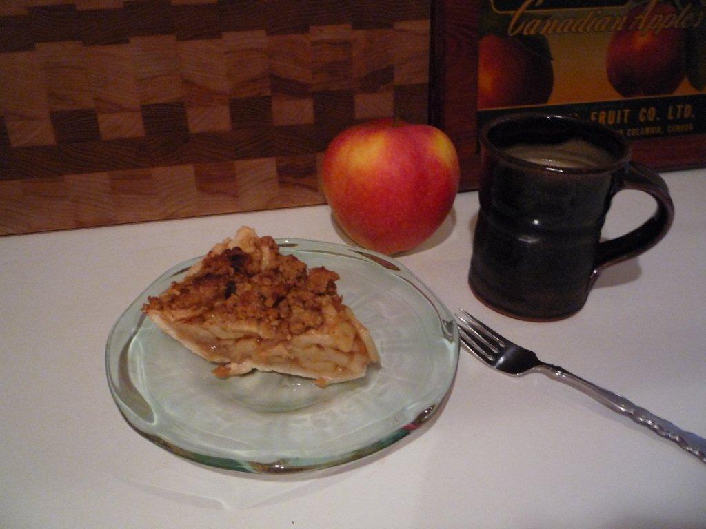 6. Place the apple mixture into the pie crust. It will be a heaped mound and seem like too many apples but that’s okay because the apples will shrink as they bake. Sprinkle the crumble topping on the apples pressing it down a bit. Place the pie into the preheated oven and bake for 20 minutes, reduce the temperature to 350 degrees C then cover loosely with foil and bake for an additional 30 minutes. Cool for 2 hours before serving.