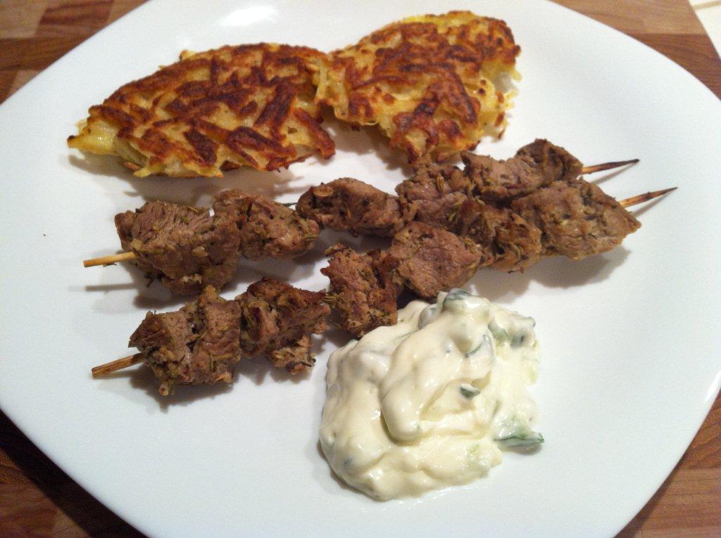 5. While the lamb is in the oven, combine the remaining 2 tbsp lemon juice with the sour cream, mayonaise, and cucumbers in a small serving bowl. Press the garlic clove through a press and stir into the sauce along with a dash of salt and pepper. Serve the cucumber sauce with the lamb skewers.