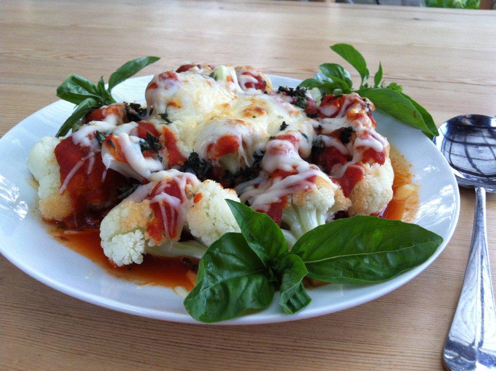 2. Spoon marinara sauce over the cauliflower. Then sprinkle with the mozzarella and the parmesan and the basil. Place casserole into oven and bake for 10 minutes until cheese is melted and beginning to brown. Garnish with some fresh basil and serve.