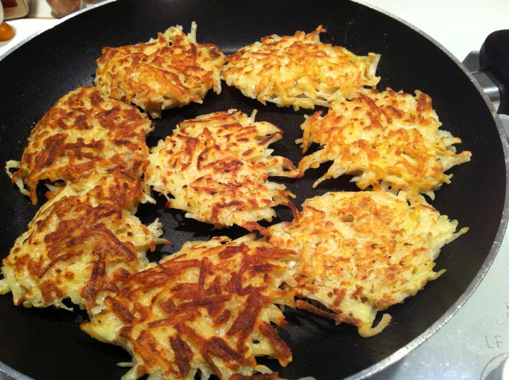 2. Heat 1 tbsp of oil and 1 tsp butter in a large non-stick skillet until butter begins to foam. Drop serving spoonfuls of potato mixture into the skillet. Turn heat to medium and cover skillet and cook the potato pancakes for 5 minutes. Flip over and cook uncovered for another 5 minutes.