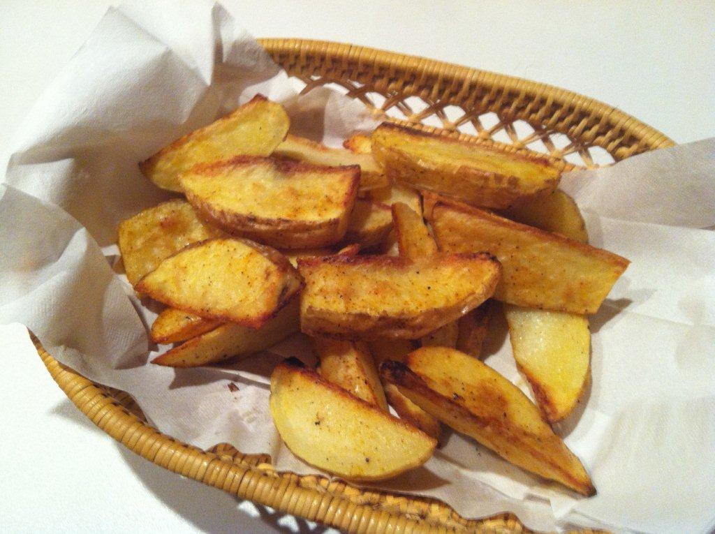 3. Rinse wedges in collander and drain well mopping lightly with a piece of paper towel. Place potato wedges into a large bowl and drizzle with olive oil. Mix well with your hands so that the oil is distributed among the potatoes. Place wedges skin side down onto parchment paper in one layer . Sprinkle with seasoning salt. Bake for 30 minutes, then remove tray from oven and move potatoes from the outer edges to the center and move the pieces from the center to the outside edges of the baking tray. Continue to bake for another 15-20 minutes, or until lightly browned and crispy.