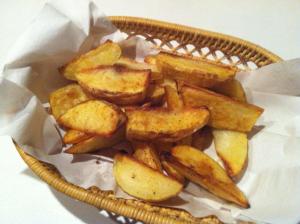 2. Wash potatoes and slice each potato in half lengthwise. Slice each potato half into 8 lengthwise wedges and place into collander.
